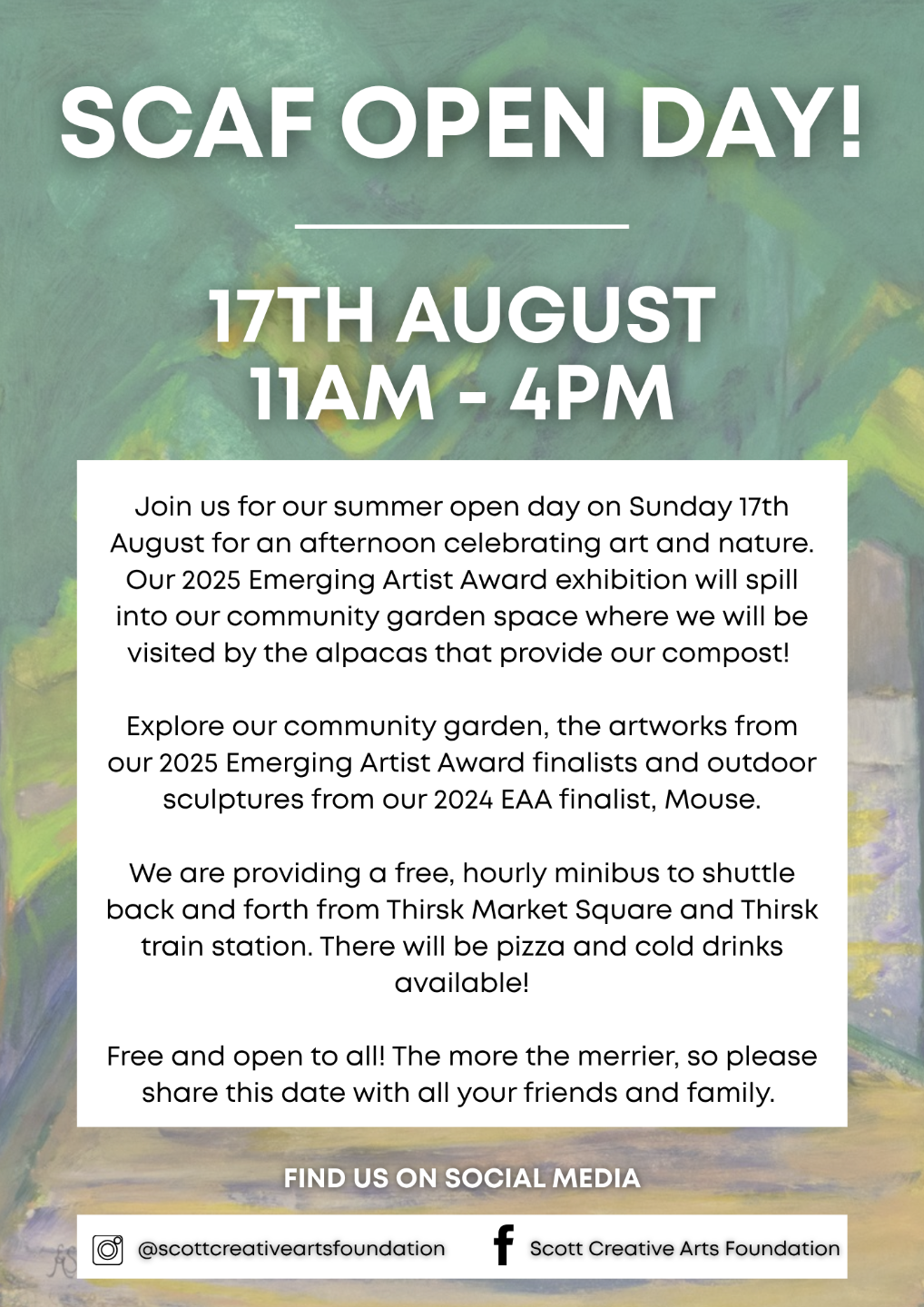 Here at SCAF we have an exciting events, opportunities, and updates to share with you all. Whether you're an artist or simply an admirer of the arts, signing up to our mailing list is the best way to see SCAF's updates on a regular basis direct to your inbox! Â