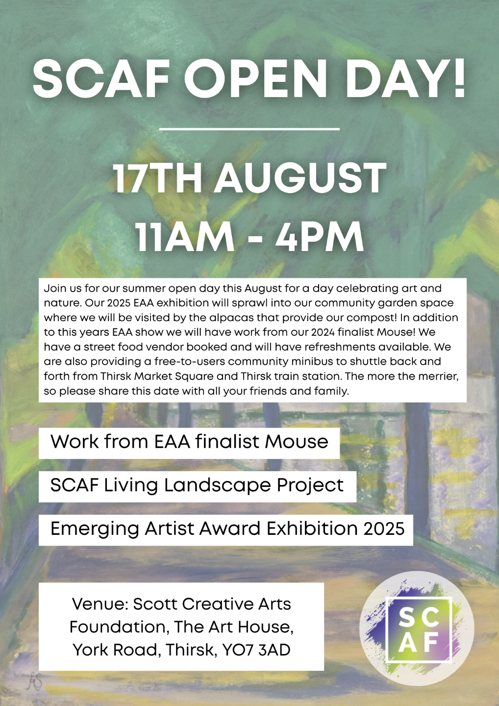 SCAF hold an annual arts award for emerging artists within the Yorkshire region. Each year 10 proposals are chosen by our panel of judges and the shortlisted artists are invited to exhibit at The Art House within the heart of North Yorkshire.